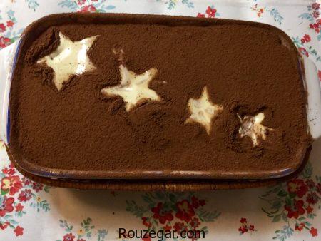 در این مرحله ظرف مناسبی آماده می کنیم و کف آن را با یک لایه ازکرم، که آماده کردیم می پوشانیم و بر روی آن بیسکویت های لیدی فینگر را که کمی آن را در قهوه خیس کرده ایم می چینیم. بیسکویت ها را خیلی خیس نکنید چون ممکن است له شوند. دوباره بر روی آن یک لایه دیگر از کرم می کشیم و بیسکویت می چینیم و کرم باقی مانده را هم بر روی آن می مالیم و روی آن را با پودر کاکائو تزیین می کنیم و برای سه چهار ساعت در یخچال قرار می دهیم بعد از این که خودش را کاملا گرفت می توانیم به دلخواه برش بدهیم و سرو کنیم.