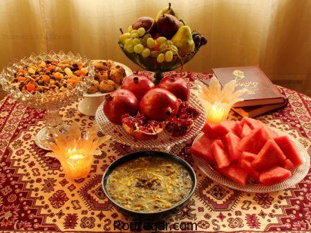 این سفره جنبه دینی داشته و مقدس بود و از ایزد خورشید روشنایی و برکت می طلبیدند تا در زمستان به خوشی سر کنند و میوه های تازه و خشک و چیزهای دیگر در سفره تمثیلی از آن بود که بهار و تابستانی پربرکت داشته باشند و همه شب را در پرتو چراغ و نور و آتش می گذراندند تا اهریمن فرصت دژخویی و تباهی نیابد. سفره شب یلدا سفره میزد است و میزد عبارت است از میوه های تر و خشک و آجیل یا به اصطلاح زرتشتیان لرک که از لوازم این جشن بود که به افتخار و ویژگی مهر یا خورشید برگزار می شد.امروز هم ایرانیان در سراسر جهان این جشن زیبا را در کنار یکدیگر برگزار می کنند و به خواندن شاهنامه و گرفتن فال حافظ می پردازند.